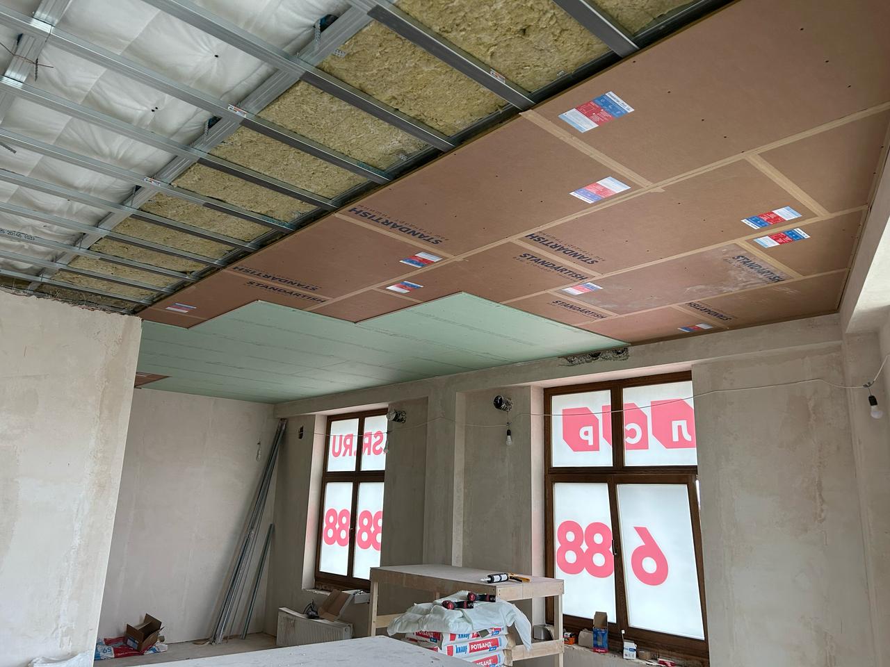 Конструкция звукоизоляционной каркасной облицовки состоит из слоя звукопоглощающих плит Standartish EKO 50, панелей Standartish Block V, слоя финишных листов звукоизолирующего Гипсокартона, виброизоляционной ленты Standartish PF-100 и Standartish-Tape, герметика Standartish GL, металлических профилей ППН 28/27 и ПП 60/27, виброподвесов Standartish SP Vibro Lite или Standartish SP.