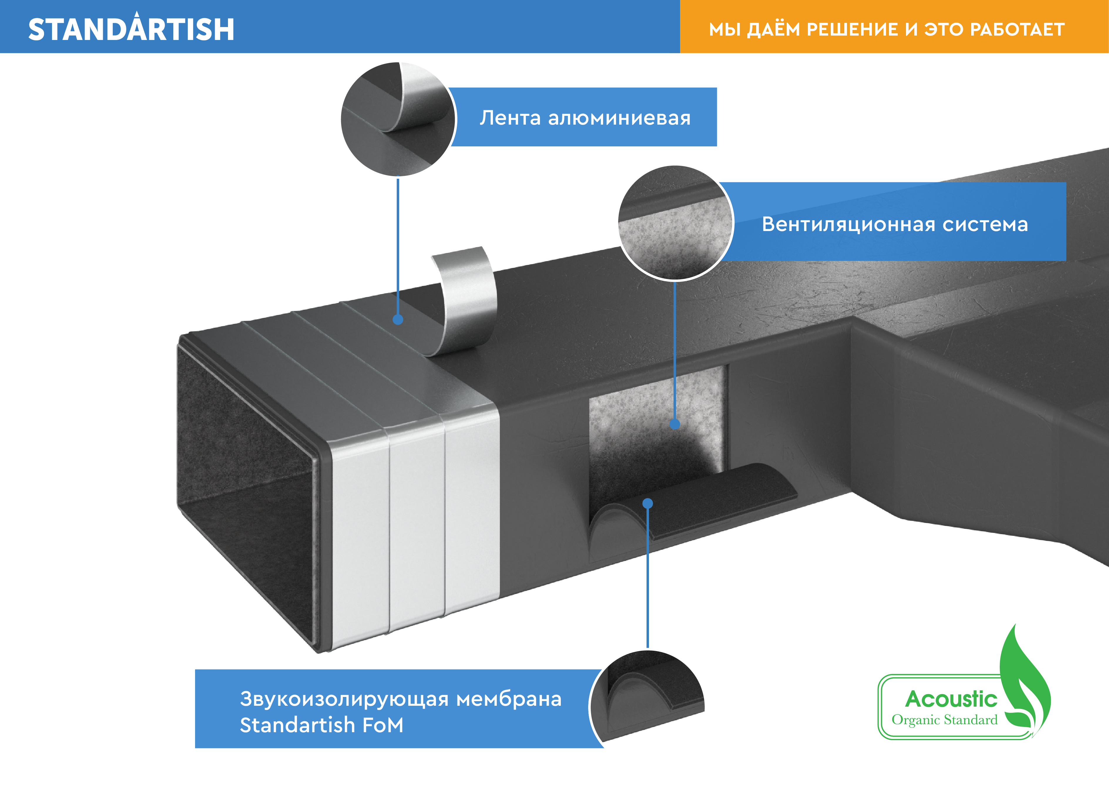 Двухслойная самоклеящаяся мембрана STANDARTISH FoM состоит из специальной каучуковой пены и мембраны Standartish ES высокой плотности. Органический полимер, служит в качестве тяжелого слоя, что приводит к резкому росту звукоизоляции.