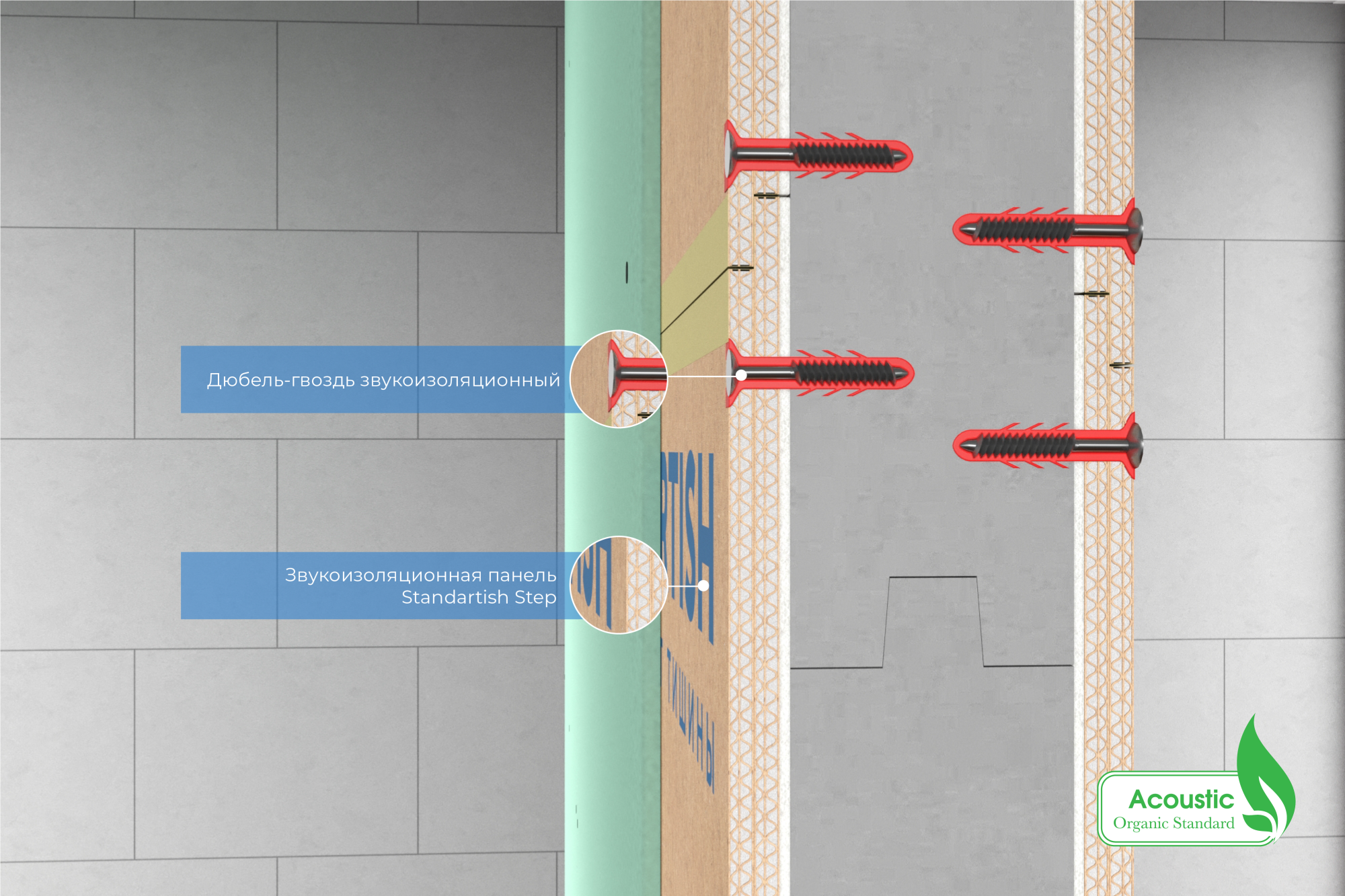 Состав: 4-х камерная комбинированная звукоизоляционная панель Standartish Step с двух сторон перегородки из камня (газобетон, бетон, кирпич) и др. материалы.