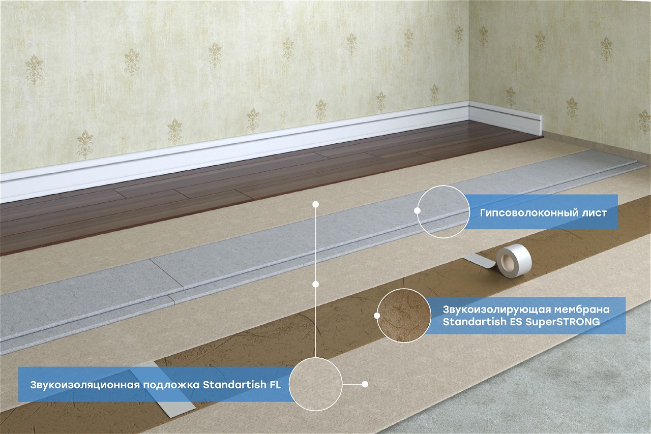 Оптимальная звукоизоляция пола под чистовое покрытие снижает ударный характер шума сверху-вниз. Конструкция состоит из слоя подложки Standartish FL в несколько слоев и мембраны Standartish ES2 / ES4 .