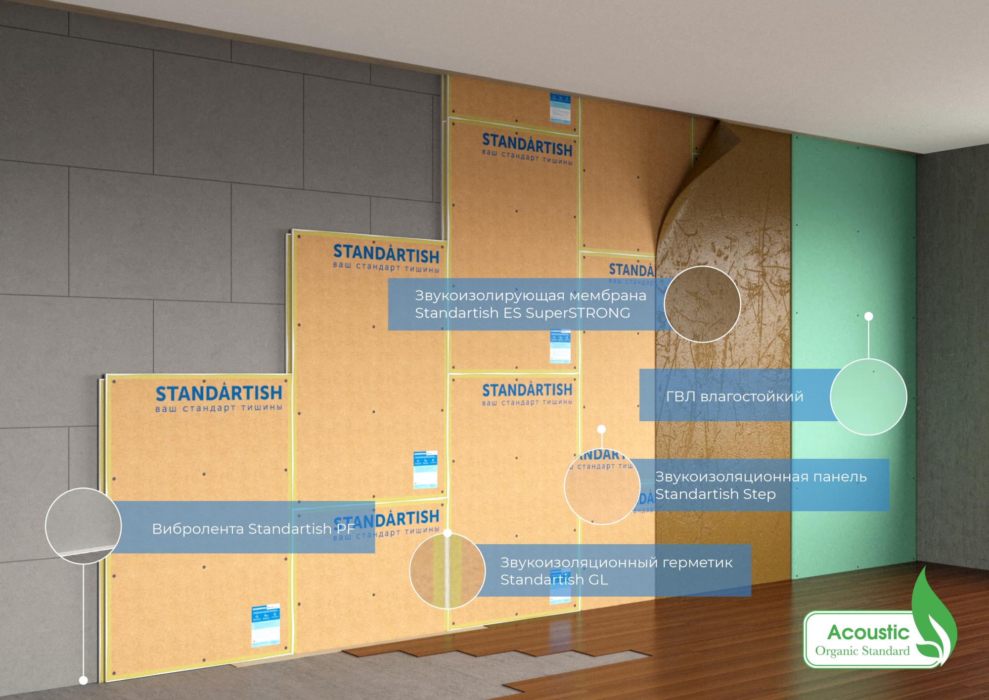 Состав: 4-х камерная комбинированная звукоизоляционная панель Standartish Step, дополнительная герметизация стыков за счет применения тяжелой мембраны Standartish ES2/ES4 и др. материалы.