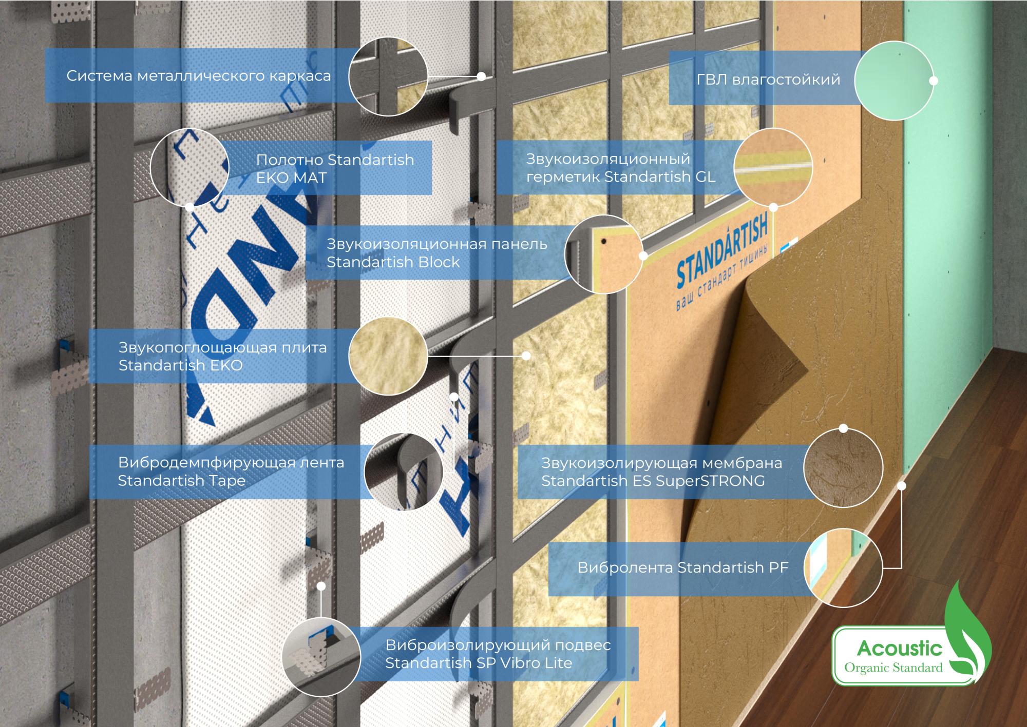 Конструкция звукоизоляционной каркасной облицовки состоит из слоя звукопоглощающих плит Standartish EKO 50, шумопоглощающего покрытия Standartish EKO MAT, панелей Standartish BlockSuperstrong, мембраны Standartish ES4 SuperStrong, слоя финишных листов звукоизолирующего Гипсокартона, виброизоляционной ленты Standartish PF-100 и Standartish-Tape, герметика Standartish GL, металлических профилей ППН 28/27 и ПП 60/27, виброподвесов Standartish SP Vibro Lite.